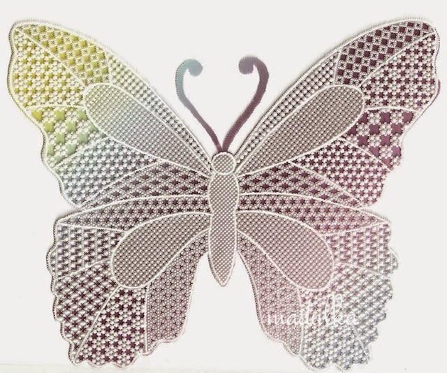 The white butterfly with pattern embossed and perforated on PCA Fine multigrid and Pergamano 19 multigrid has a background of rainbow parchment.