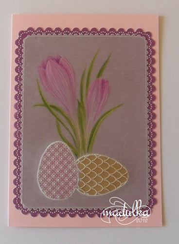 karteczka, obrazek z irysem. Irysa namalowałam kredkami Faber Castel polychromos